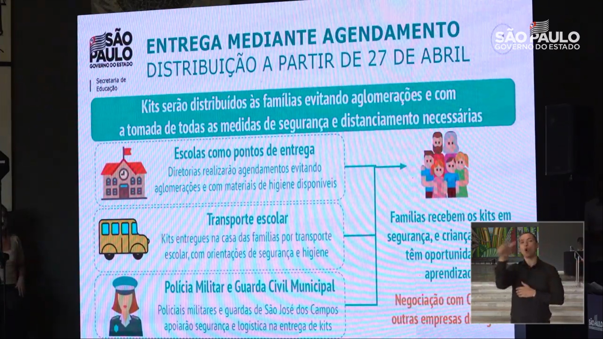 Em relação à distribuição dos materiais, o secretário reiterou que a entrega será feita por diversas formas com possibilidade de entregas na escola (por meio de agendamento), uso de transporte escolar, parcerias com Polícia Militar no processo de logística, entre outros.