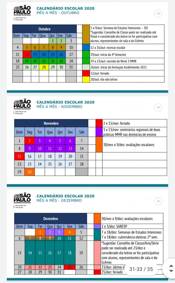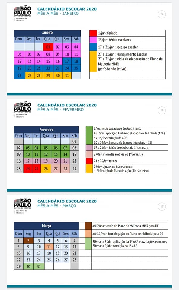 A SEDUC – Secretária de Educaçao de São Paulo divulga a proposta do Calendário para o ano letivo de 2020.