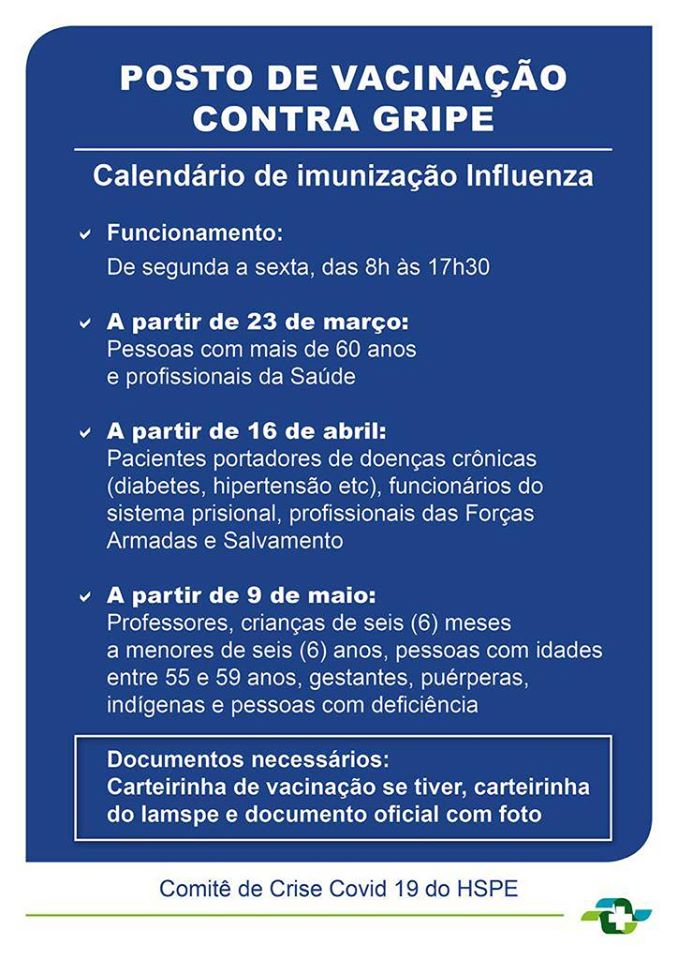 HSPE segue calendário de vacinação contra a gripe durante a pandemia do Coronavírus.