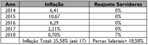 Percebe-se uma grave perda no poder de compra dos docentes que não recebiam reajuste desde 2014. No ano de 2018 a carreira do magistério recebeu um reajuste de 7%, o que cobriu cerca 1/4 das perdas salariais causadas pela inflação do período 2014 – 2017.