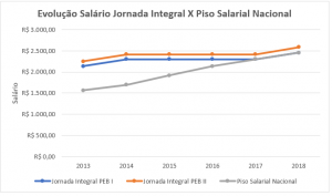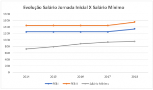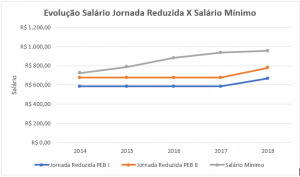 Agora, acompanhe o gráfico de evolução salário PEB I e PEB II para jornada reduzida: