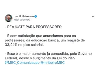 Foi anunciado no perfil oficial do Twitter do presidente da república – Jair Bolsonaro – que o Ministério da Educação definiu o reajuste do piso salarial nacional dos professores da educação básica.