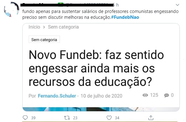 No Twitter, simpatizantes do governo como o Allan dos Santos, sobem a hashtag #fundebnao. Quase todas sem fundamento, como no caso de internautas que falam a respeito de pesquisas de esquerda, e universidades com esquerdistas. Tais internautas não entendem que o Fundeb não tem relação com o Ensino Superior. Também desconhecem a importância dessa política para a manutenção da educação pública.