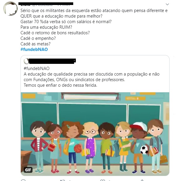 Internautas e apoiadores do governo iniciaram uma campanha no Twitter com a hashtag #FundebNão. A iniciativa tem como objetivo reforçar as ideias contrárias ao fundo de manutenção da educação básica e dar coro ao movimento contrário ao FUNDEB.