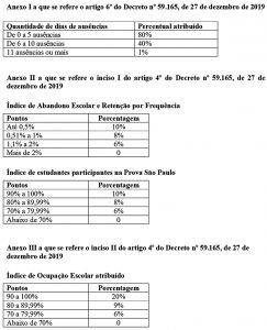 Art. 4º – O desempenho das unidades da Secretaria Municipal de Educação será aferido pelo índice de abandono, retenção por frequência e participação na Prova São Paulo, e ocupação escolar, na seguinte conformidade: