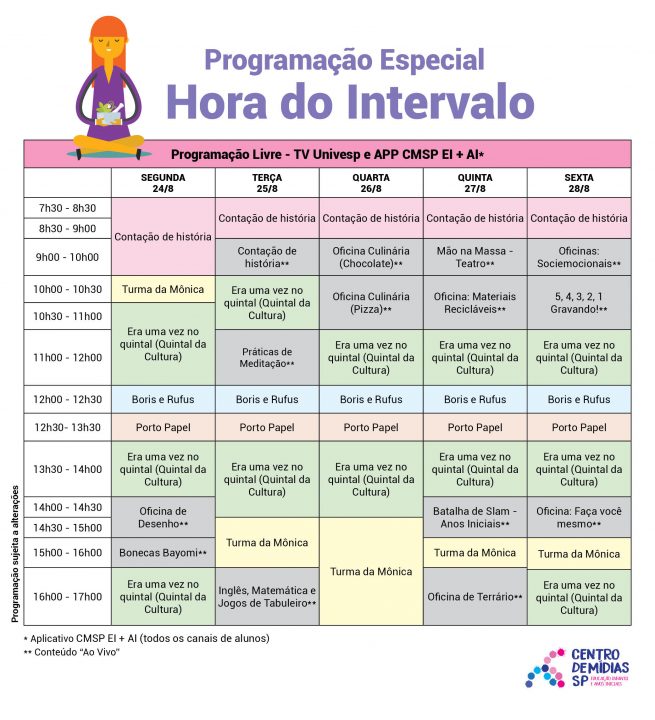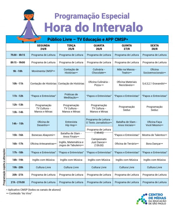 Confira a Programação Semanal Completa do Centro de Mídias São Paulo da Secretaria da Educação.