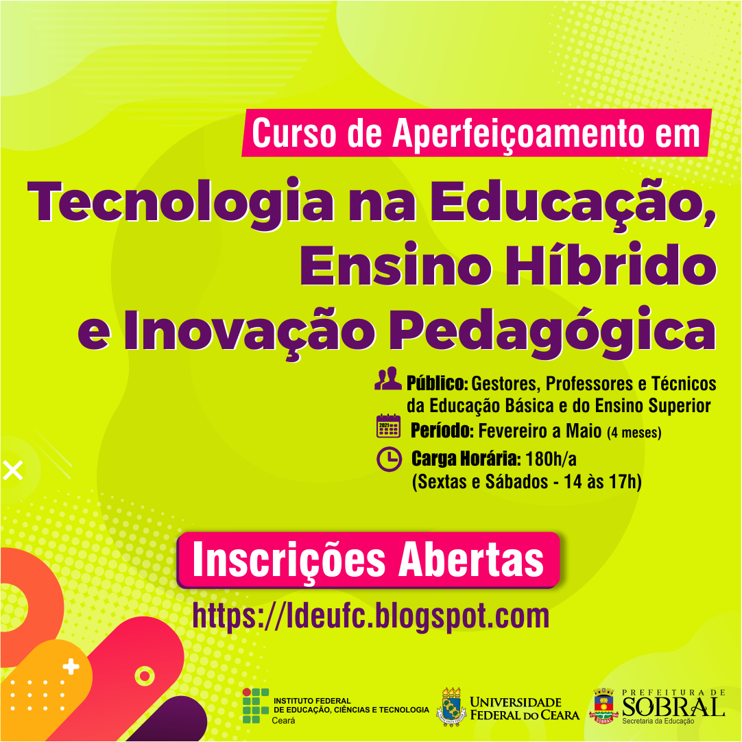 A Universidade Federal do Ceará em parceria com a Prefeitura de Sobral e o Instituto Federal do Ceará estão ofertando o curso de extensão em Tecnologia na Educação, Ensino Híbrido e Inovação Pedagógica.