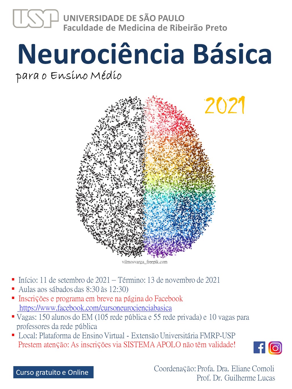 Curso: Neurociência Básica para o Ensino Médio Instituição: USP - Universidade de São Paulo Modalidade: a distância Carga Horária: 50 horas Vagas: 150 vagas Inscrições: até 31/08/2021